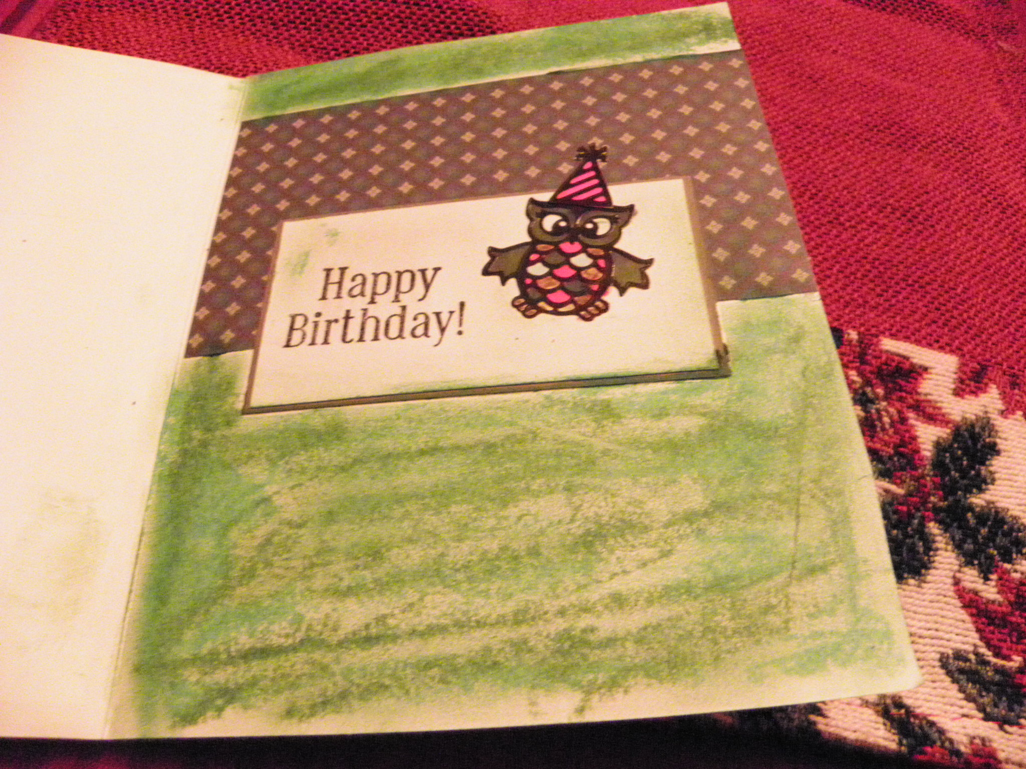 I am a fortunate person. I thank god everyday for the life I have. I raised three boys,who are all grown up now. I didn’t think time would go by so fast. Now two of my boys have found lovely girls to make memories with.This card was made for Erin. She likes owls so this card was the perfect choice for her. She is cute fun loving and kind so this is what I came up with.